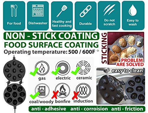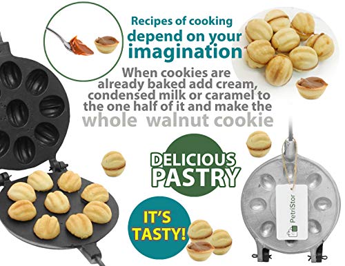 Buy only original PetriStor products. Packaging PetriStor! Walnut Cookie (Oreshek) Maker 9 nut Oreshki Rissian Soviet Cookies Pastry Oreshnitsa Орешница Food Surface Coatings Operating temperature: constant / intermittent -195 to + 260 ° С / 315 ° С (500 / 600F °) Anti-adhesive, anti-corrosion, anti-friction properties Using: 1 For food 2 Dishwasher 3 Healthy and fast cooking 4 Durable 5 Easy to wash 6 Do not scratch RECIPE: Melted butter 200 gm/0.4LB 2 eggs Sugar ¾ glasses (150 gm/0.3 LB) Salt ¼ teaspoon Vanilla to taste (optional) Baking soda 1/2 teaspoon Vinegar about 1/2 tablespoons All-purpose flour 3.5 glasses (455 gm/1 LB) Oil (to grease the maker, before baking the first batch of dough only) Mix sugar with salt, vanilla, and eggs. Pour in melted (cooled of) butter. Mix it. Pour vinegar over baking soda (above the mixture, as it will foam and escape from the spoon), and stir it really well. Add the flour (1 glass at a time). Knead the dough on the table. Form little balls. Use a ½ teaspoon measuring spoon, and they turned out to be just the perfect size. Preheat the greased maker. Place the balls into the form. Keep it about a minute and a half on one side, and then about a minute on the other. You can peek during the cooking to see if the shells are getting golden in color. After they are baked, you just open it above the plate and the nut shells falling right out. 10 simple steps to extend the life of your updated dishes: When using for the first time, wipe the surface with the soft side of the sponge with detergent, rinse under warm water! When it dries, apply vegetable oil to the surface. All is ready! Always cook on low and medium heat! This will help to keep healthy items in the food! Use only wooden and silicone kitchen spatulas! Do not use caustic and aggressive detergents for cleaning Teflon surfaces! Do not allow the occurrence of soot! Do not allow the occurrence of soot! Do not expose the surface of dishes to metal objects.