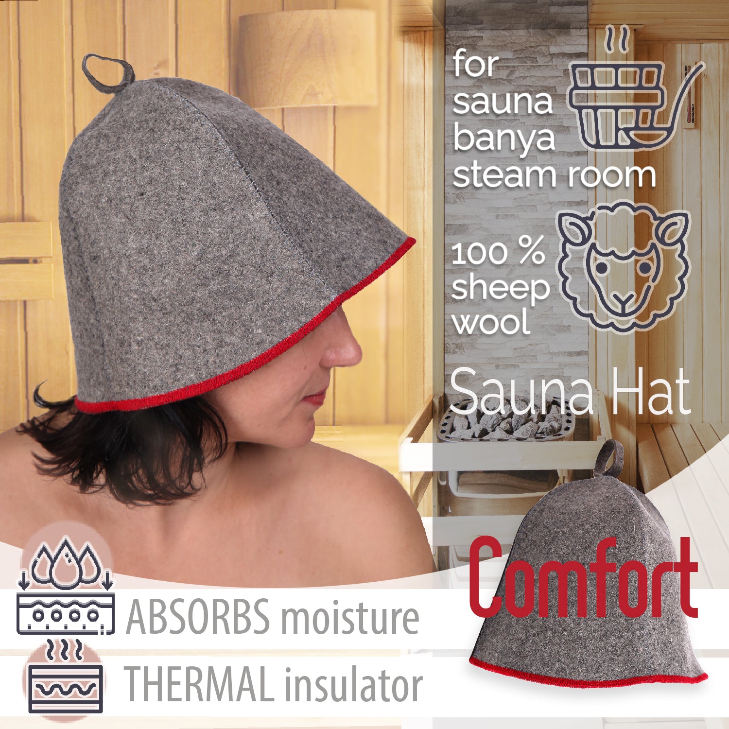 Sauna Hat Comfort Gray with red Natural Heat Regulation: Wool sauna hats offer optimal heat regulation, ensuring a comfortable and controlled sauna experience. Moisture-Wicking Properties: The natural fibers of wool absorb and wick away moisture, keeping your head dry and maintaining a pleasant sauna environment. Exceptional Insulation: Wool provides superior insulation, trapping heat to keep you warm without overheating during intense sauna sessions. Premium Quality: Crafted from high-quality wool, our sauna hats are designed for durability and comfort, ensuring a luxurious and lasting sauna session. Fashionable Designs: Choose from a variety of chic designs to suit your style. Our woolen sauna hats not only enhance your comfort but also add a touch of flair to your sauna routine. One Size Fits All: With a comfortable fit. Our sauna hats are designed to accommodate all head sizes, providing a snug and secure feel for everyone. Perfect Gift Idea: Surprise your loved ones. These wool sauna hats make for a unique and thoughtful present for sauna enthusias.