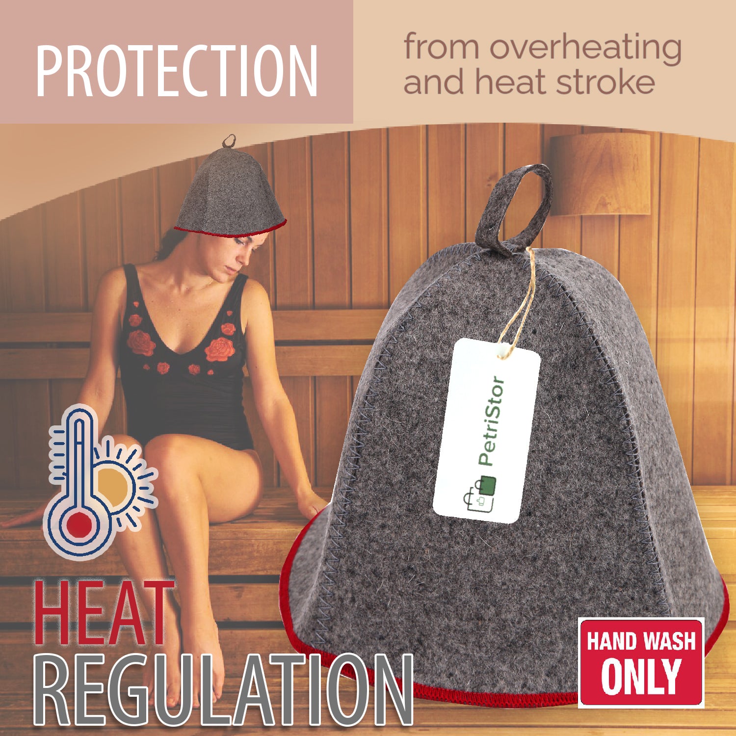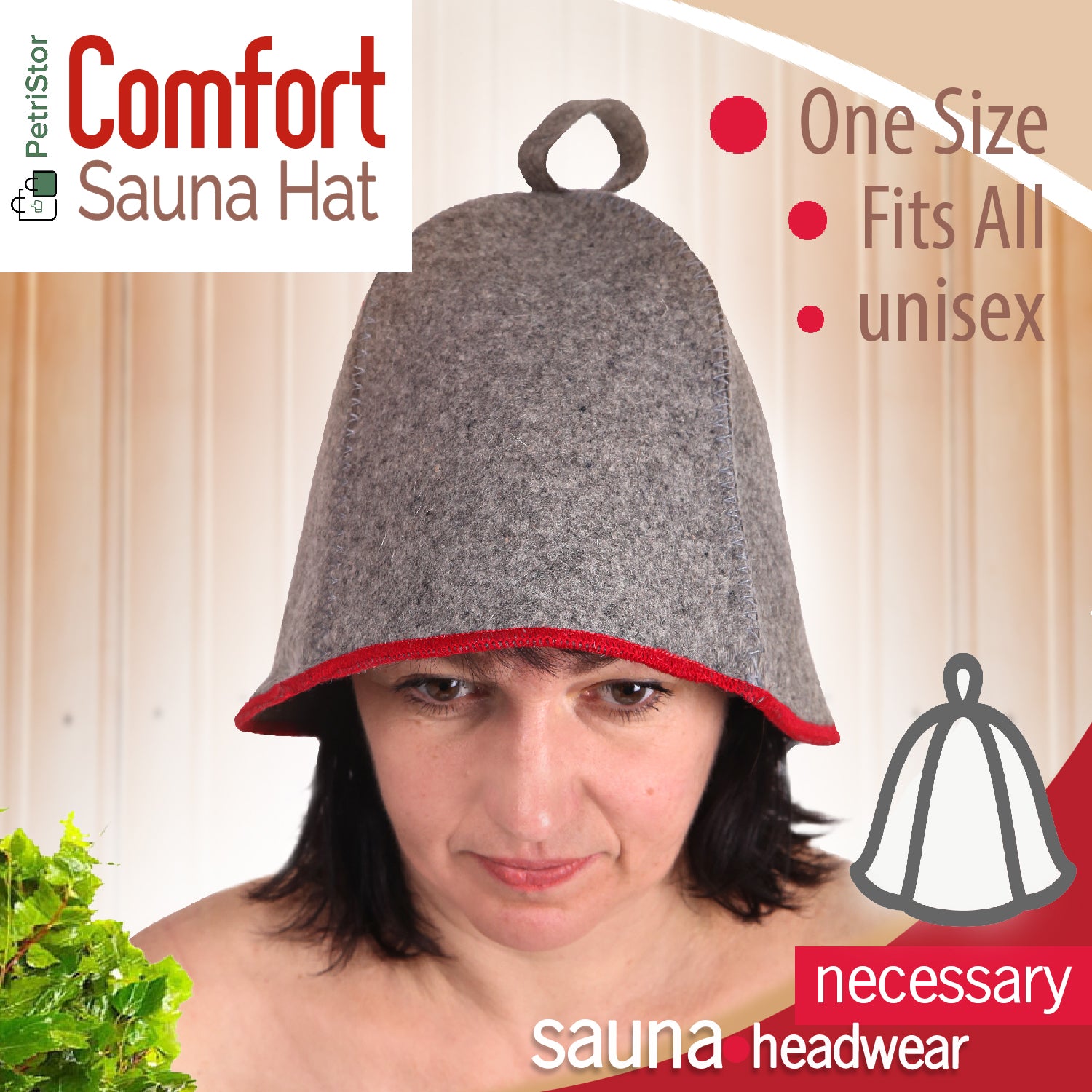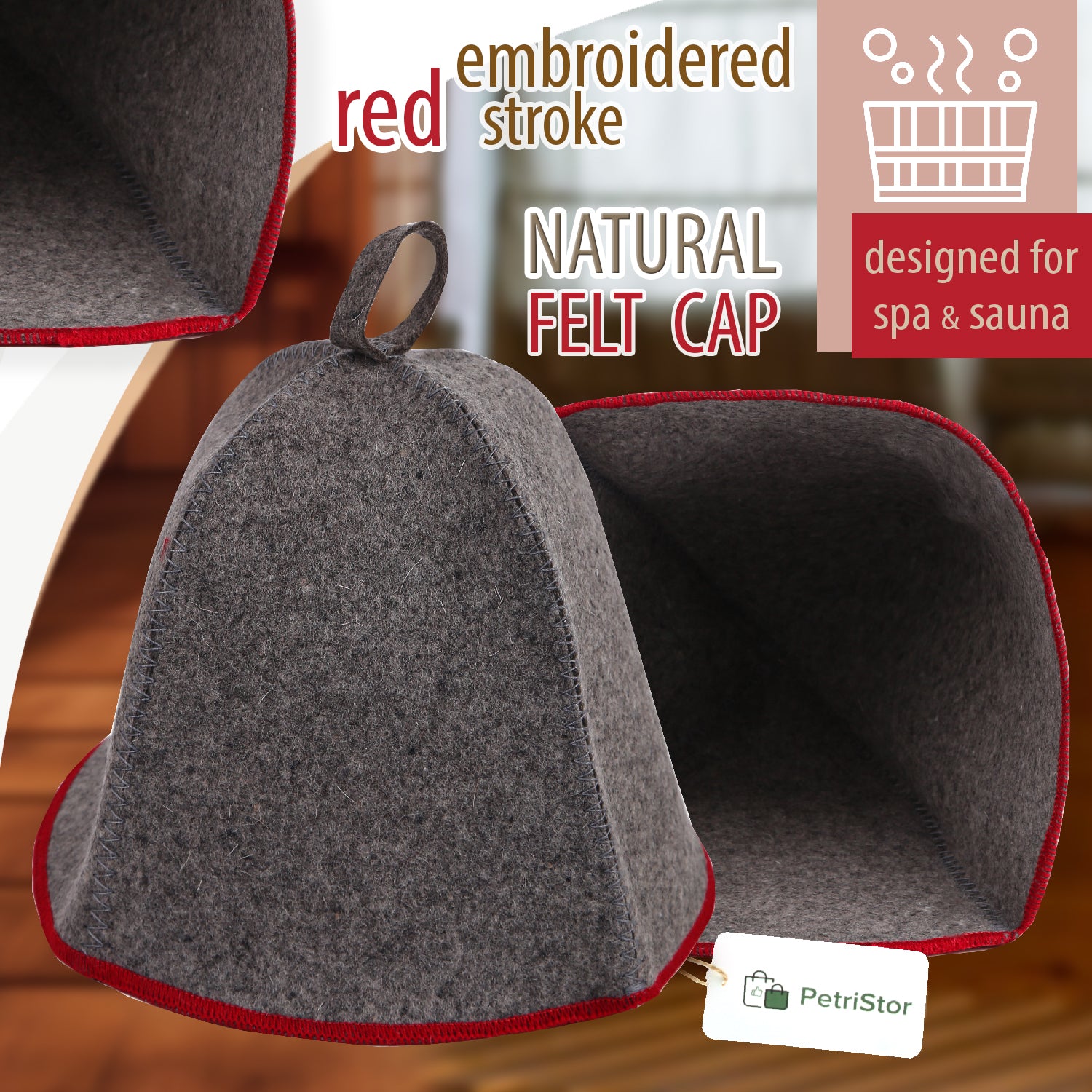 PetriStor Sauna Hat Comfort - Sauna Hat for Women - Wool Sauna Hat - Sauna Hat for Men - Bathhouse hat - Natural Felt Sauna Cap (Gray with red)
