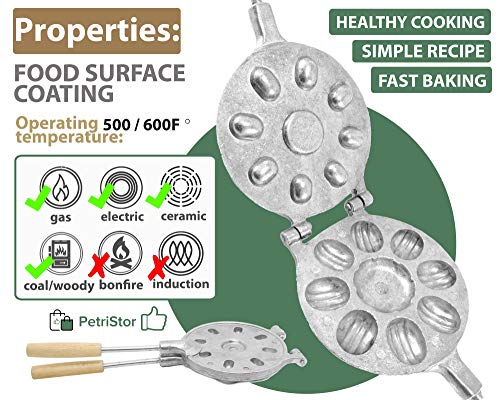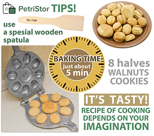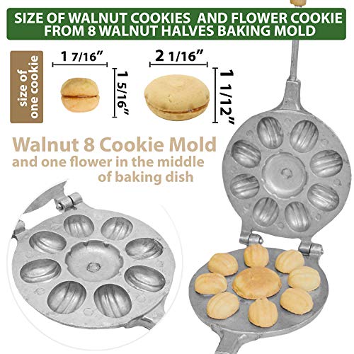 ORESHKI NUTS METAL MOLD FOR SWEET RUSSIAN ORESHKI/NUTS 8 and 1 flower. With our oreshki mold preparation of Russian oreshki will be interesting and easy. You will get very very tasty home oreshki spending a minimum of efforts. This mold is simple in use - even your child will be able to do tasty oreshki. Why you should eat tasteless half-finished goods- if you can do the home sweet oreshki much faster with this mold! 8 at one time!!! You will receive detailed recipe with photos! FEATURES Brand: New Material: Metal Color: Metal Weight: 867g / 1.9 lb Overall dimensions of the form: 36.5 x 15 x 2.5cm / 14.5 x 6 x 1 inches. The external dimensions of one walnut halves: length - 3 cm, width - 4 cm depth - 1 cm. From one form turns 8 nuts and 1 flower 5 x 5 x 1 cm. / 1.9 x 1.9 x 1.3 inches.