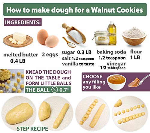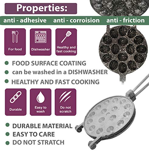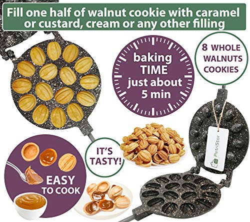 Buy only original PetriStor products. Packaging PetriStor! Walnut Cookie Maker 16 halves non-stick coating granite stone Cookies Pastry. Food Surface Coatings Operating temperature: constant / intermittent -195 to + 260 ° С / 315 ° С (500 / 600F °) Anti-adhesive, anti-corrosion, anti-friction properties Using: 1 For food 2 Dishwasher 3 Healthy and fast cooking 4 Durable 5 Easy to wash 6 Do not scratch RECIPE: Melted butter 200 gm/0.4LB 2 eggs Sugar ¾ glasses (150 gm/0.3 LB) Salt ¼ teaspoon Vanilla to taste (optional) Baking soda 1/2 teaspoon Vinegar about 1/2 .tablespoons All-purpose flour 3.5 glasses (455 gm/1 LB) Oil (to grease the maker, before baking the first batch of dough only) Mix sugar with salt, vanilla, and eggs. Pour in melted (cooled of) butter. Mix it. Pour vinegar over baking soda (above the mixture, as it will foam and escape from the spoon), and stir it really well. Add the flour (1 glass at a time). Knead the dough on the table. Form little balls. Use a ½ teaspoon measuring spoon, and they turned out to be just the perfect size. Preheat the greased maker. Place the balls into the form. Keep it about a minute and a half on one side, and then about a minute on the other. You can peek during the cooking to see if the shells are getting golden in color. After they are baked, you just open it above the plate and the nut shells falling right out. 10 simple steps to extend the life of your updated dishes: When using for the first time, wipe the surface with the soft side of the sponge with detergent, rinse under warm water! When it dries, apply vegetable oil to the surface. All is ready! Always cook on low and medium heat! This will help to keep healthy items in the food! Use only wooden and silicone kitchen spatulas! Do not use caustic and aggressive detergents for cleaning Teflon surfaces! Do not allow the occurrence of soot! Do not allow the occurrence of soot! Do not expose the surface of dishes to metal objects.